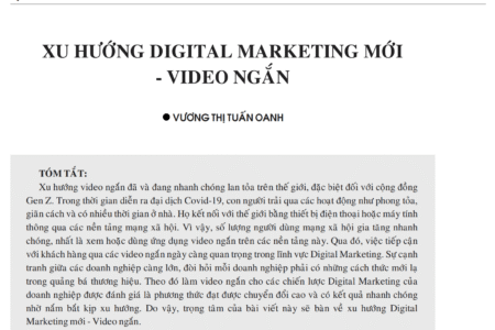 XU HƯỚNG DIGITAL MARKETING MỚI – VIDEO NGẮN Vương Thị Tuấn Oanh Tiêu đề bài báo: XU HƯỚNG DIGITAL MARKETING MỚI – VIDEO NGẮN Tên tác giả đầy đủ: Vương Thị Tuấn Oanh (VTT Oanh). Tên tạp chí/hội nghị: Tạp chí Công Thương, ISSN.0866-7756 Số …